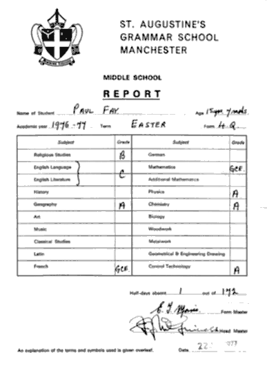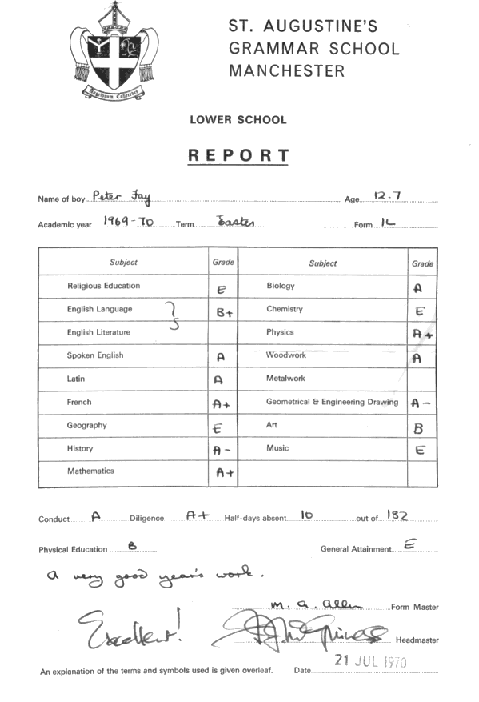 5. Attendance is indicated by showing the number of half-days of absence from the date of the last report to the date of this report. 6. Written reports sent to parents at the end of term are based mainly on terminal examinations. For more information about their sons work and progress, parents are strongly recommended to come to the School to meet the teaching staff whenever the opportunity is arranged. 7.This report is a confidential document sent by the School to the parents. There is never any need to show it to apropective employer. When a boy leaves the School, parents are recommended to ask the Headmaster to give him a reference.